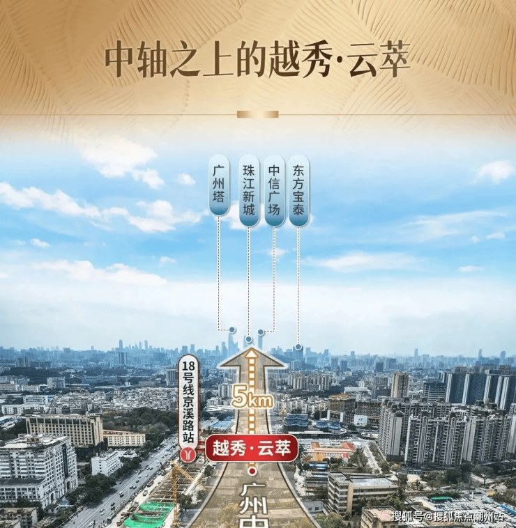 广州越秀云萃的位置在天河与白云交界处,距离珠江新城约5公里,说是“白云地界、天河生活”毫不夸张。自驾走广州大道或沙太路,能快速直达珠江新城。越秀云萃位于越秀云悦北面约 150 米,紧邻地铁 18 号线北延线京溪站。该地块是越秀地产在 2025 年 4 月 30 日经过 26 次竞价举牌,以 14.1515 亿元竞得的,溢价率 21.46%,成交楼面价 33623 元 /㎡,足以见得该地段的价值潜力。