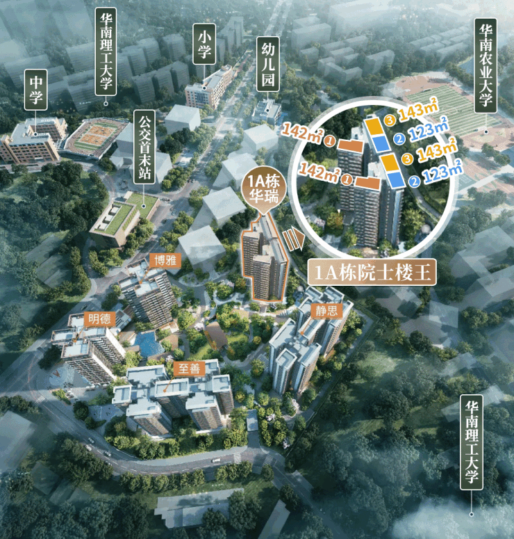 周边环绕华南理工大学、华南师范大学等高校,学术氛围浓厚,教育资源得天独厚。高校在旁,与高校教授、院士、研究院科创人才为邻;据第七次人口普查数据显示,五山街道更是广州高知家庭的聚集地,辖区内大学及以上学历人口占比高达67.6%,生源多源于高知家庭,生源优质。