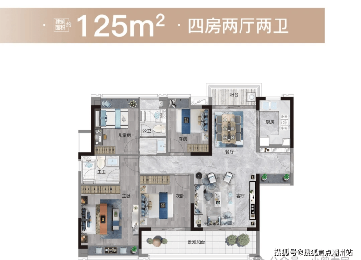 整个户型中,三开间全部朝南,确保不同家庭成员都享有超高的居住舒适度。南北双阳台的设计,也预留了家务空间,让南向观景面更纯粹。