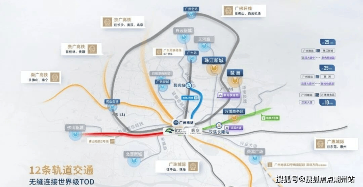 交通配套:12轨交汇,4高铁+4城际+4地铁;30分钟纵享主城繁华生活,1小时大湾区生活体验,8小时面向全国。5条快速干线 ,30分钟主城繁华生活圈至天河(105国道—广州大道),至海珠(东晓南射线),至荔湾(东新高速),至万博(南大干线)。广佛东环城际铁路即将开通,无需中转,3 站到琶洲、4 站到金融城,半小时达白云机场,广深港高铁更是让穗港通勤仅 47 分钟,大湾区城市因城际铁路紧密相连,城市漫游仿若乘地铁般便捷。