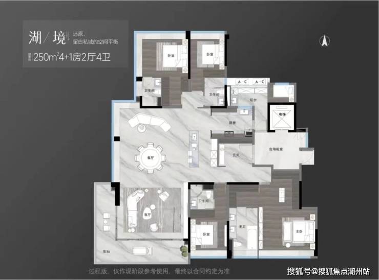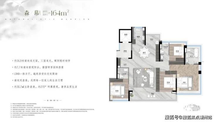 建面190平四房三卫,四开间朝南,9.4米观景阳台,客厅与次卧打通的话,客厅开间也可达9.4米,超43平的主卧,270度环幕飘窗,
