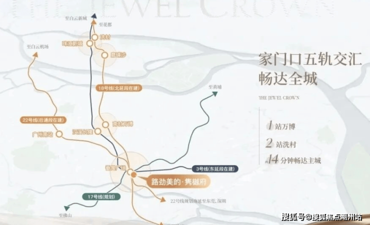 交通配套项目距离最近的地铁站3号线番禺广场站约800-900米左右,在这里有4条地铁交汇,分别为18-22-3号线,还有规划中的17号线,去珠江新城、琶洲都是直达过去