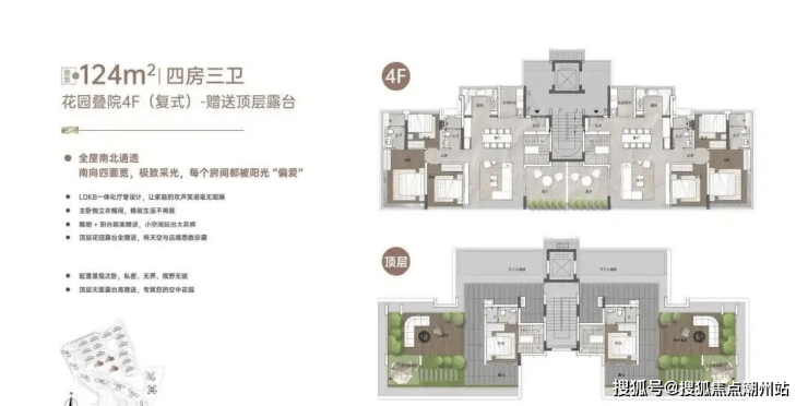 这是最接近墅级形态的户型,下层做了侧花园设计,顶层的天面露台全赠送,实现了约242%的使用率。