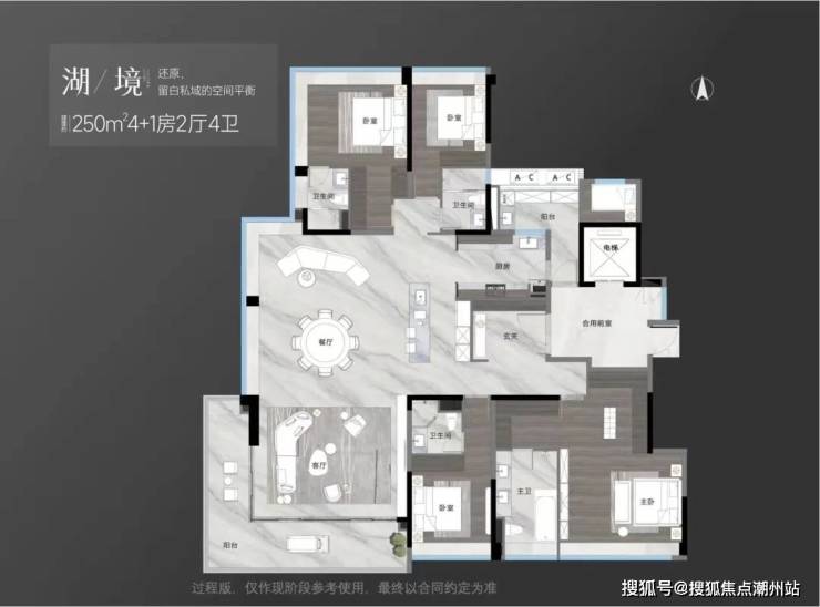 建面约164㎡4房3卫,四开间朝南,16.9米南向采光,270°景观大主卧。