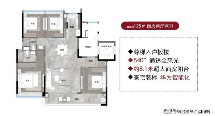 户型信息建面约125㎡4房2厅2卫,8.1米超宽大阳台。首推小面积四房产品。