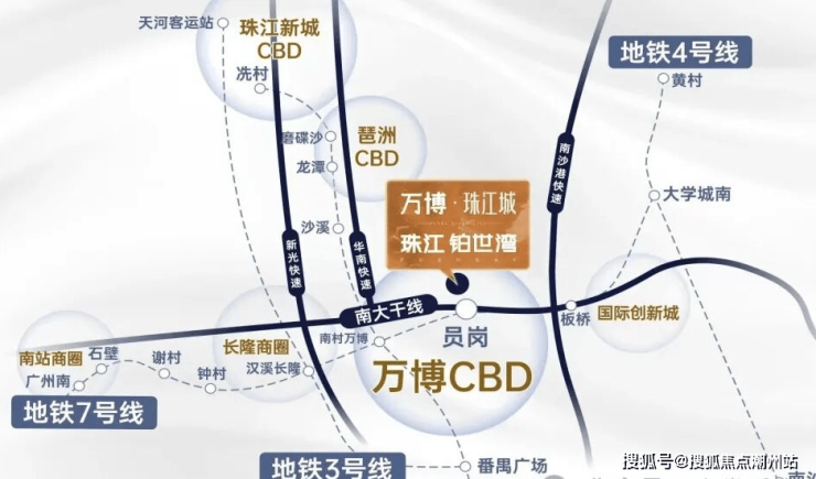 项目位于江山高尔夫俱乐部东侧,地处广州城市中轴&南大干线经济带双中轴交汇点,屹立于万博CBD唯一的滨江带上,“CBD城市顶尖资源+景观顶尖资源”的王牌资源在此双向奔赴,演绎珠江上的伟大重逢。项目超300万㎡产城融合代表作,重点布局“住宅-商业-产业-交通-教育-生态”6大领域,以8大价值打造宜居、宜游、宜业的理想幸福之城。