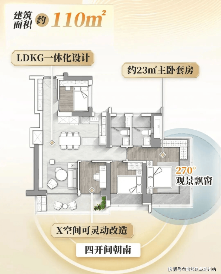 215㎡大平层,3梯3户,带超大入户前室,拥有约9.6米南向大景观阳台,和主卧270°观景飘窗,看园林景观。