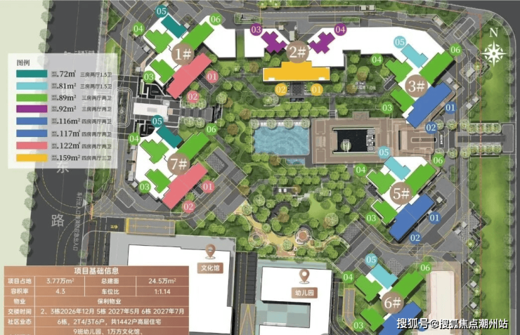 项目楼栋分布和户型:保利.招商华发中央公馆采用围合式设计,6栋47层高塔楼设计,小区自身配建有文化体育场馆和幼儿园,除了2#楼王是两梯四户,其余均为三梯六户,8#是5层高的文化馆,9#是配建3层高的幼儿园。