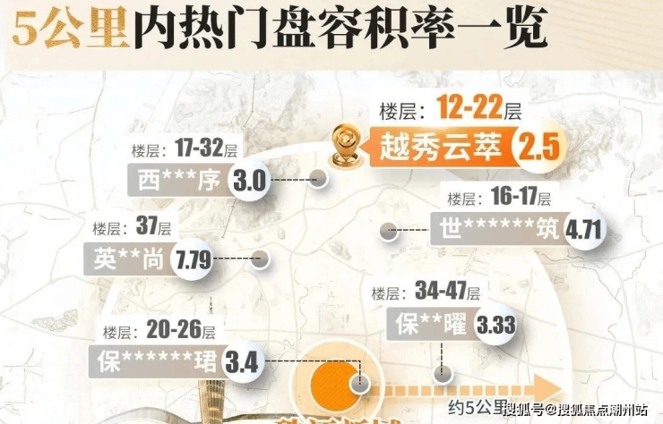 由于地段金贵,珠江新城5公里范围内的社区,普遍向天空要高度,容积率破3.0,甚至超过7.0,已是常态。