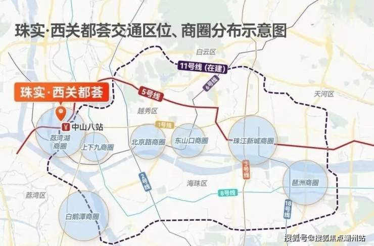 项目距离地铁5号线直线仅约500米,周边还汇聚5+11号线和34条公交线路,5号线可直达珠江新城、金融城。11号线作为内部大环线,能一线直达火车站、广州东站、琶洲、白鹅潭、广船等重要板块。自驾通过南岸路与中山八路交汇处,无缝衔接中山路、东风路、环市路等城市主干道。