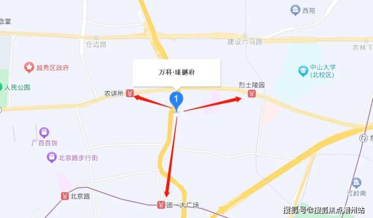 万科·瑧樾府位于越秀老城区腹地,位于中山三路以南,东濠涌的东侧。项目距地铁1号线农讲所约400米,6号线团一大广场站约700米,交通还算便利。由于位于老城区,周边生活气息也较为浓厚。