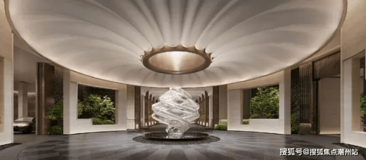 会所南大堂,纵深层次感极强,凸显线条感的壁灯以及敞开的大师定制铜门,将视线延长并聚焦到了正中的(潮涌)雕塑,凸显点睛之笔。