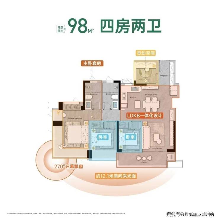 产品建面约88-108㎡三至四房, 是科学城首个使用率接近100%;建面约88㎡户型有两种,都做到了三房带主套。