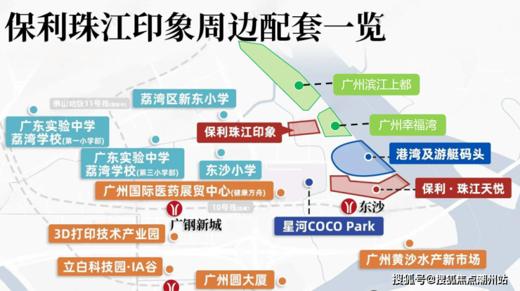 教育配套幼儿园:项目配建一所 6 班幼儿园,广州市荔湾区沙洛幼儿园距离小区约 661 米。小学:西南部规划有 24 班省级小学,已确定由荔湾传统名校康有为纪念小学承办,广州市荔湾区东沙小学距离小区约 673 米。中学:周边 3 公里范围内有真光实验中学和东沙博雅实验学校等,此外还有规划中的 45 班完全中学。其他:2 公里范围内还覆盖省实广钢校区第一小学部、省实广钢校区第二小学部、华师附小、荔湾爱莎国际学校等多所名校。