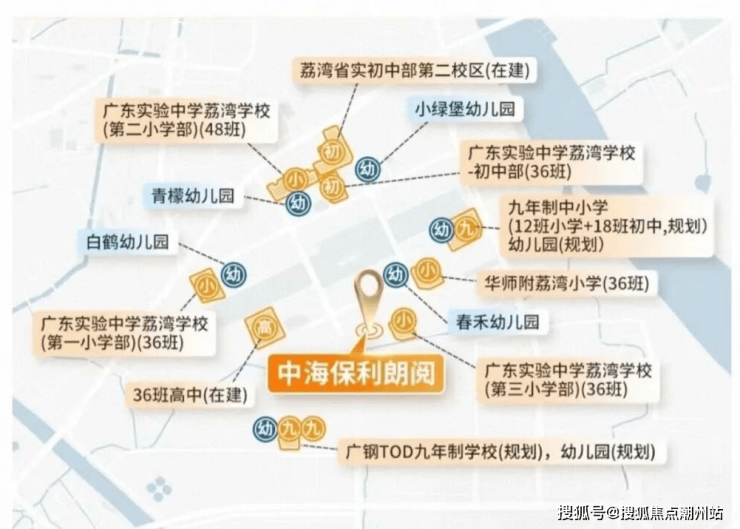 项目教育配套:项目一路之隔就是广东实验中学荔湾学校第三小学部,已于2022年9月开学,今年三年级。周边有省实一小,省实二小,华师附小,广东实验中学荔湾学校。项目自身配建2所中学,一所36班初中/一所36班高中在建中,其中一间已确定为广东省实验初中预计2025年竣工。
