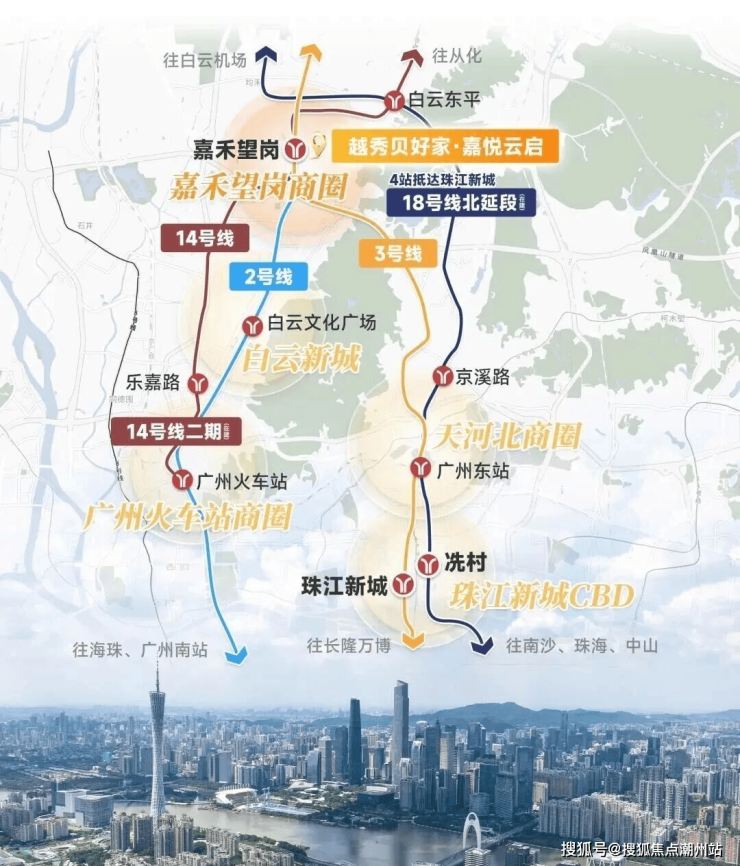 其中,3号线到机场、珠城、天河北,2号线到白云新城、公园前,都是核心产业区,且是直达,半小时通勤圈。