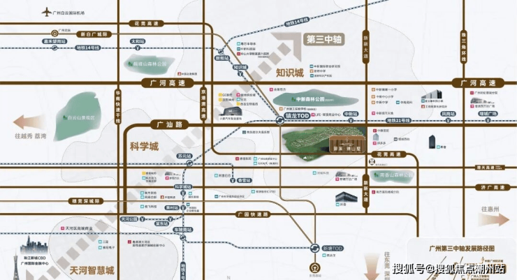 项目距地铁21号线中新站仅约500米,通过家门口的21号线,便可实现1站镇龙TOD、4站天河。而镇龙TOD,又可进一步握手“3地铁+1城轨+5高速”的超级路网,通过14号线可快速畅连黄埔、白云核芯区;搭乘新白广城轨,2站可达新塘,从知识城出发,到达白云机场仅3站,连接穗莞深城际直达深圳机场,快意纵横大湾区。自驾出行同样便捷,华南快速、广河高速、广园快速、增天高速(在建)等4纵6横城市主干道环绕,从家门口驶上干道,便可快速穿越广州主城区。