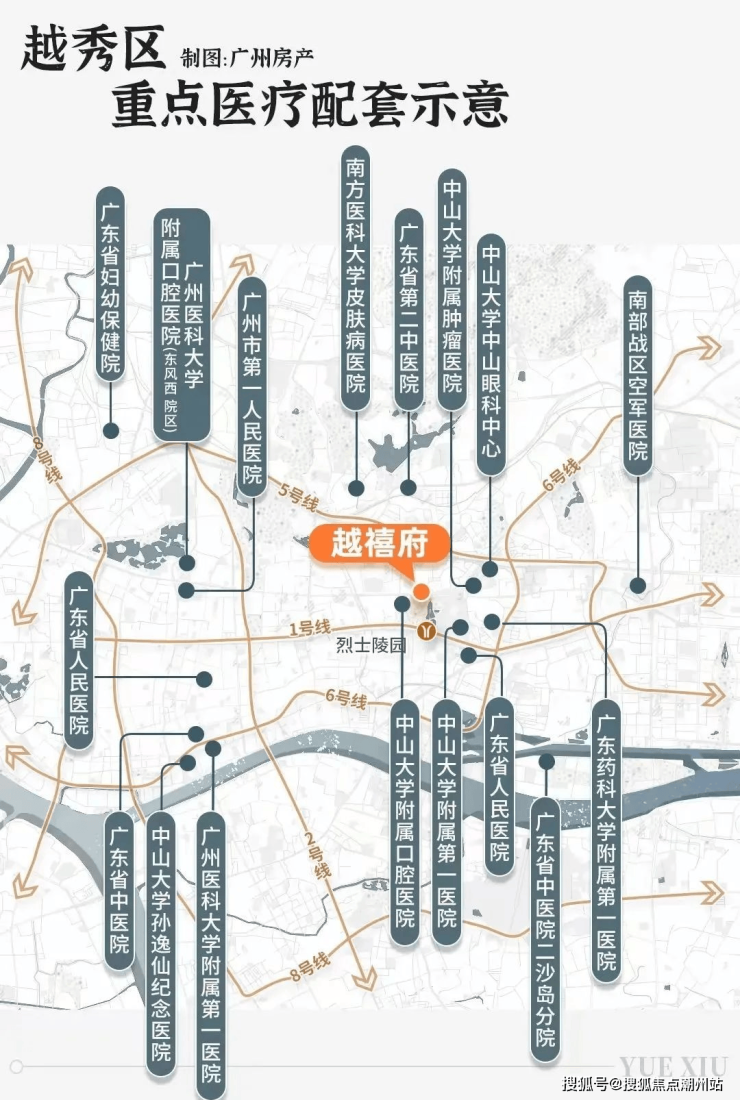 医疗配套优质医疗资源环绕,健康生活无忧。项目坐落于广州越秀区核心医疗圈,周边汇聚14家知名三甲医院(车程约10分钟),占全市三甲医院总量的近40%。步行仅5分钟即可到达4所顶尖医疗机构: 医科大学附属第一医院(综合实力强劲) 、 中山大学附属第一医院(华南地区医疗标杆) 、 中山眼科医院(全国知名专科医院) 、 肿瘤医院(权威肿瘤诊疗中心) 。