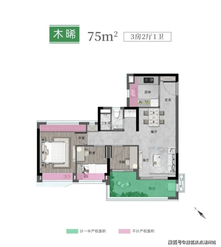 75㎡三房卫,四开间朝南,约5.2米大阳台,超10米南向展面。
