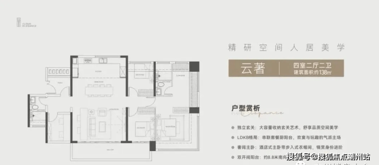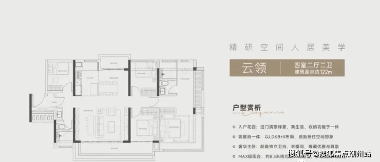 【云领】建面约122㎡四房两厅两卫配入户花园,公卫设在玄关旁,方便外出归家简单清洗。LDKB大厅配南北对流双阳台,其中景观阳台开间去到7.8米左右。这个大阳台包含了部分赠送花池,新规后如果花池底板和阳台地坪高差小于0.4米就要半计容了,它在新规前报批还能吃到全赠送的利好。