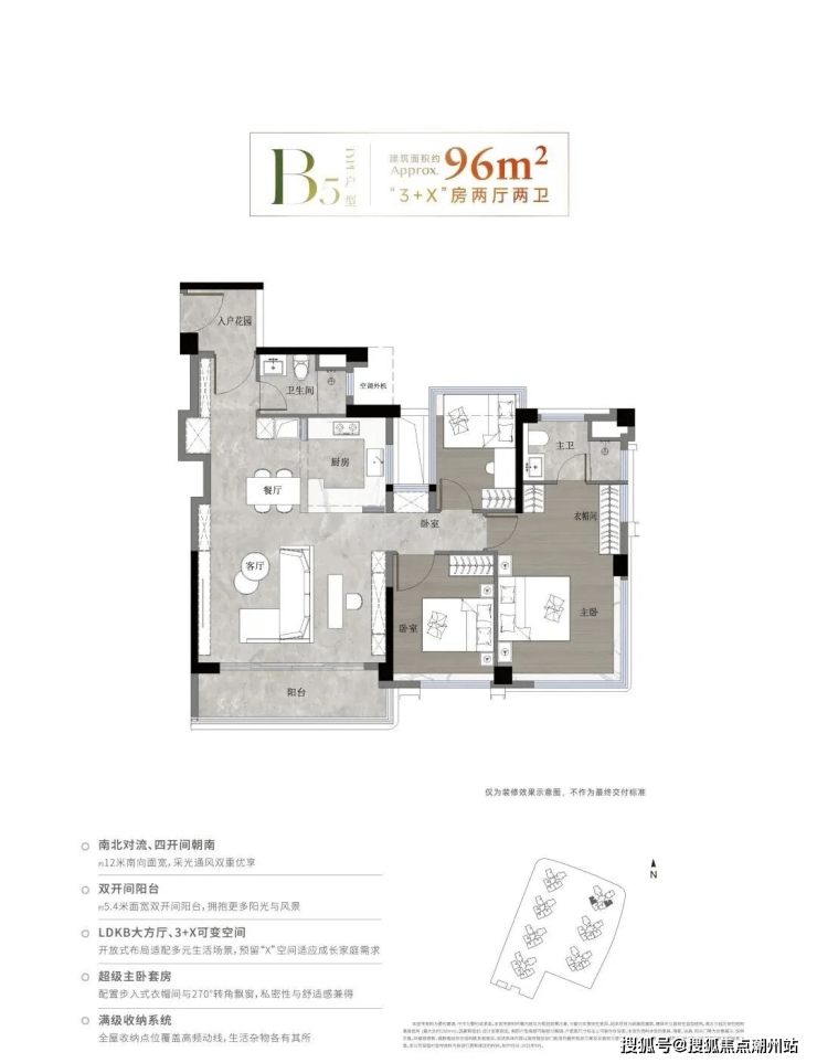 【建面约 96 ㎡ 3+X 房两卫】建面使用率高达 110-118%(套内使用率 138-148%),使用面积约 111-115 ㎡,