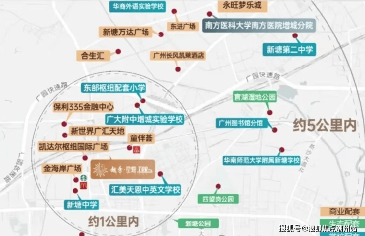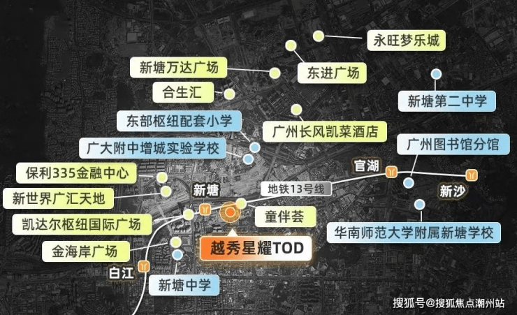 位于广州市增城区新塘聚宝路与丰华西路交叉口西北400米处,广州地铁13号线新塘站附近;占位大湾区黄金A字尖端、广州东部TOD枢纽中心,享十轨交汇(5地铁3高铁2城轨)环绕,轻松畅达全广州,贯穿广深等湾区核心城市;三大核芯功能区,三大千亿级产业集群,拥享湾区黄金资源辐射。