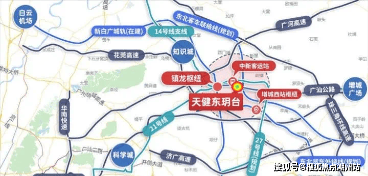 项目交通:地铁——直线距离广州地铁21号线中新地铁站800米左右,1站到镇龙站(14号线),2站科学城,3站到天河;21号线直达员村、14号线串联知识城、27号线直达新塘交通枢纽(规划);城轨有新白广城轨(镇龙站到广州白云机场、深圳机场);莞深-新白广城际穿梭大湾区核心城市(北至广州北站、白云机场,南达东莞虎门火车站、深圳宝安机场,西连佛山西站、广州东站等);