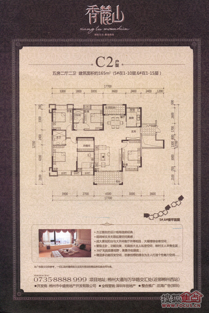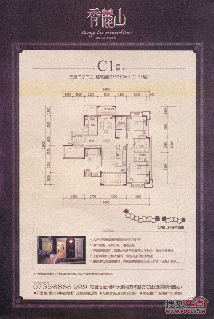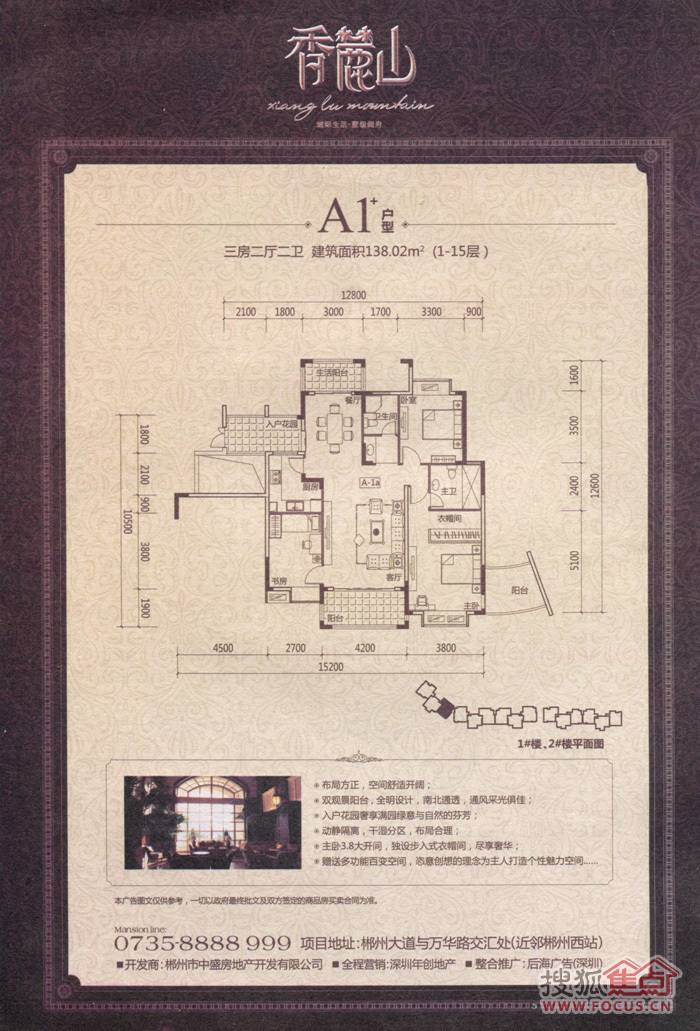 香麓山项目占地面积6.7万平米,总建筑面积12万余平米,容积率仅1.8,绿化率37.8%,是郴州目前少有的低密度高尚住。