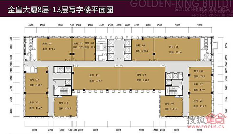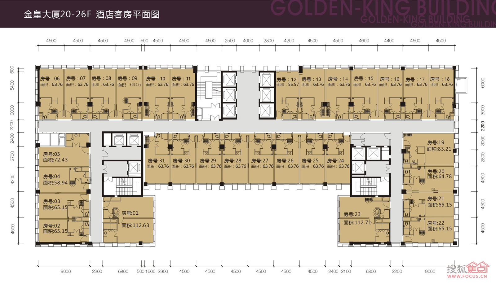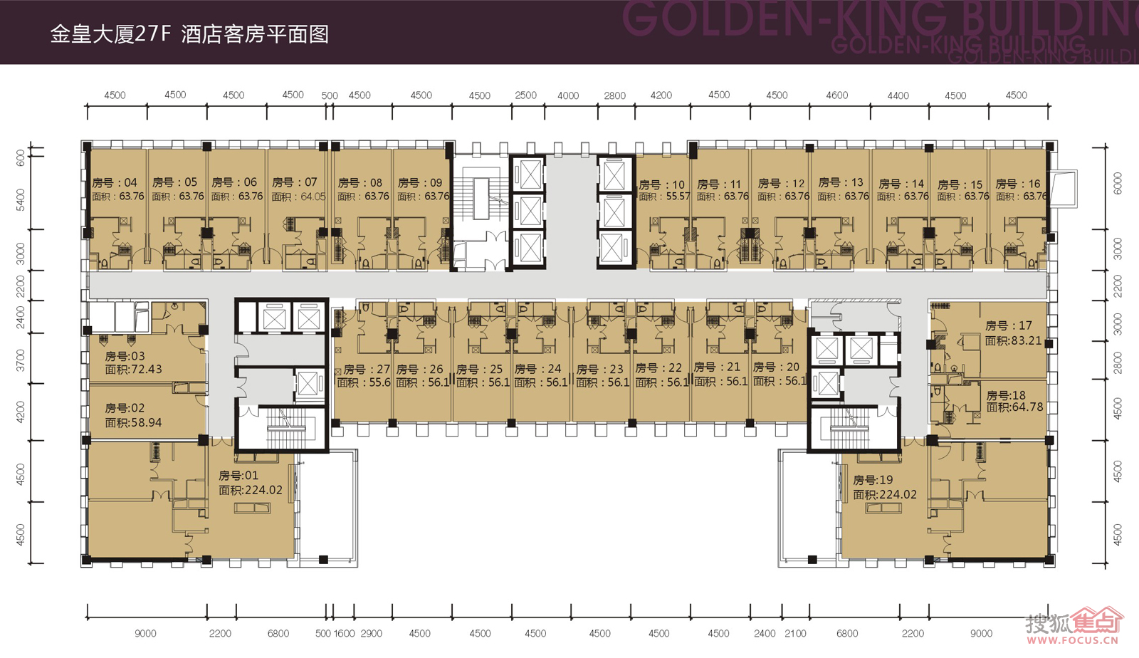 金皇大厦总占地面积:13049.7m2,总建筑面积:87486.36 m2(其中地上建筑面积:87486.36 m2,地下建筑面积:1560.6 m2),金皇大厦共27层,客梯6个,办公室电梯4个,楼梯7处,地面停车位52个,地下停车位406个;大厦1-3层是挑空设计, 1层为大堂,总面积:1238 m2,层高13.9m,设有少许的商业和银行, 2-3层拥有多间不同规格的会议室和特色主题餐厅,另外,多功能会议室可容纳上千人的会议或宴会, 4层休闲足浴中心, 5层大型宴会厅,面积:669.98 m2,厅内配备了声控、光控、同声传译等高端商务设备,6层大型游泳池,面积:2112 m2, 7层是有色金属交易中心, 8-18层是5A级写字楼,共11层,大小办公室多达143套,较大的面积有300多m2,最小的也有150多m2, 19-25层为精装公寓,南北朝向,采光好,环境舒适、优雅,室内统一配备中央空调,26-27层是套间公寓,共2层,55套公寓。金皇大厦康体娱乐项目齐全,健身中心、SPA中心、足浴、桑拿等设施能较大程度满足上班白领一族和休闲渡假商务人士的需求,可谓办公之余也能让自身充分得到释放,做到真正的劳逸结合。