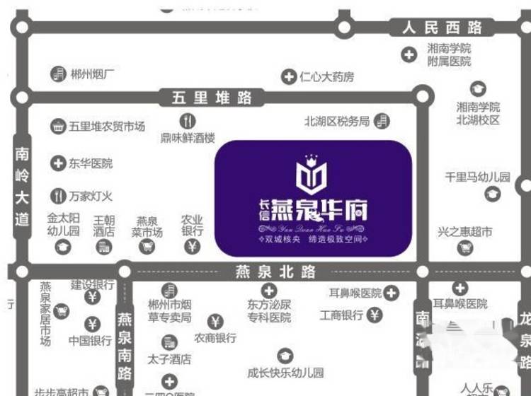 燕泉华府汇聚移动、联通、电信三大总部,紧邻五岭广场、北湖公园两大商圈,商场、茶坊、影音馆、时装店林立,有市政府、北湖区政府、市劳动局、市农机局、市烟草专卖局等。市五中、附属中学、郴江中心完小、市三完小、北湖实验中学、市九中、一中五岭阁校区等名校云集,周边银行(工行、中行、建行、农行、邮政储蓄等)、超市(人人乐、沃尔玛、步步高)、购物中心、酒店(燕泉广场、文化路和八一商业街、红歌汇KTV、南国雨林和皇家休闲会所)、有一医院南院、二四0医院、妇幼保健站、市中医院、现代女子医院等生活配套齐全。