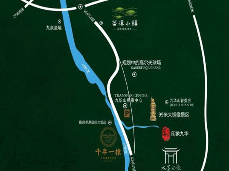 茶溪小镇地处九华山风景区黄金地带,位于上山必经之路九五公路旁,路网通达,交通便利,距离换乘中心仅3分钟车程,距离九华山机场仅30公里,池州市区40公里,青阳县20公路,省城合肥200公里,距离南京240公里,均有高速公路。
