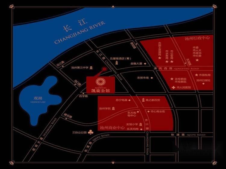 池州市城安置业发展有限公司开发的凯旋公馆项目,位于昭明大道与长江北路交汇处,即昭明大道以北,长江北路以西,该项目占地约45824平方米,总建筑面积约136000平方米。其中地上115000平方米(含一层商业11000平方米)地下21000平方米,一层为商业,二层以上均为住宅,共9栋。是池州仅有的纯高层住宅小区,小区规划采用两个组团,两天轴线,南北通透,两组团之间有约80米的日照间距,阳光充沛。该项目采用人车分流设计,小区的绿化面积约12000平方米,绿化率高达37.4%,占整个小区面积的三分之一以上,建筑密度为23.3%容积率为2.5%,小区内设有停车位510辆(其中地下室405辆,地上105辆)。