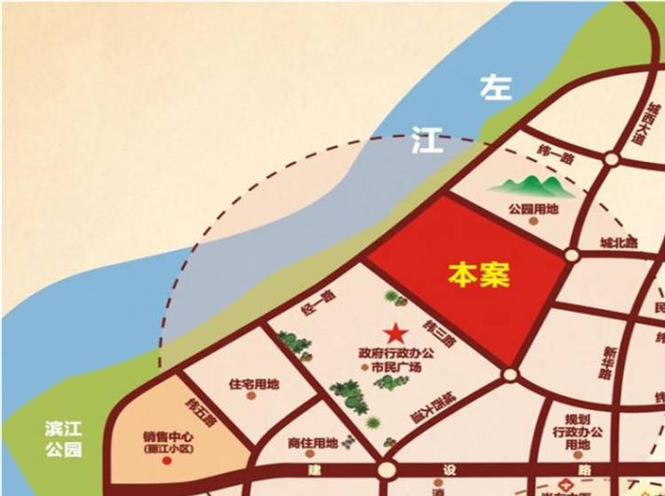 项目位于滨江北路,紧邻江滨公园、丽江码头(建设中)、丽江大桥(规划中)、江州区政府市民广场及公园(规划中),民族中学。
