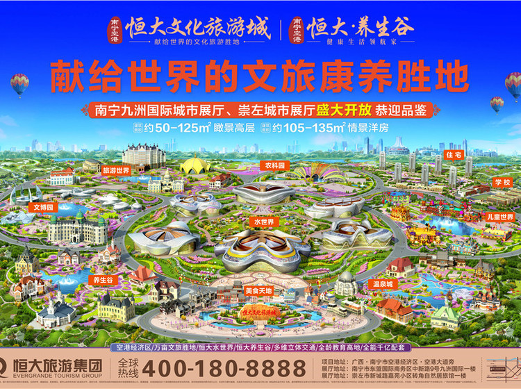 南宁空港恒大文化旅游城由世界500强企业恒大集团旗下恒大旅游集团倾力钜制,汇聚全球知名设计师,全方位构建文化旅游综合体版图。项目地处中国-东盟南宁空港经济区,南宁城市副中心,享南宁-空港半小时生活圈,坐享多维立体交通——机场、轻轨、高速、高铁,无缝连接城市生活,接轨国际生活。项目总占地28000余亩,规划打造恒大水世界、恒大养生谷、儿童世界、旅游世界、九国温泉城、世界文博园、美食天地、智慧农科园等八大国际高级配套集群,建成后将成为集游乐、文化、休闲、商业、旅居、疗养于一体的高级文化旅游康养胜地,其规模宏大、定位先进,将会开启广西居住3.0时代。
