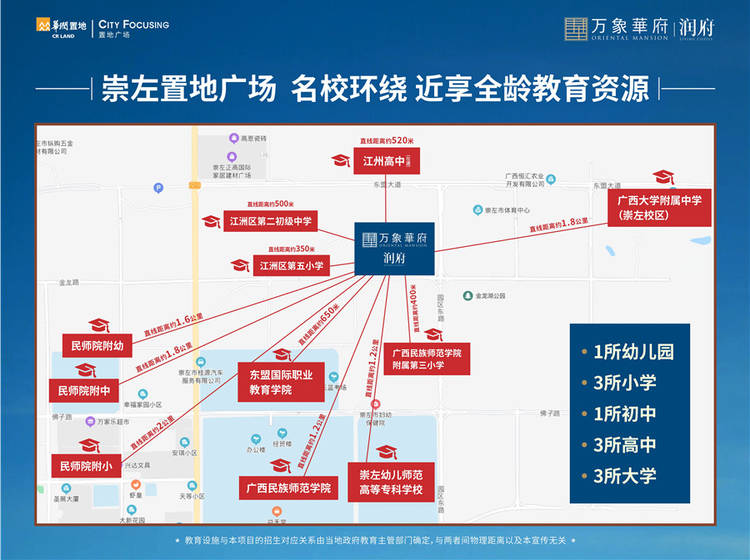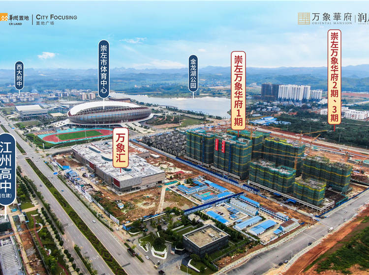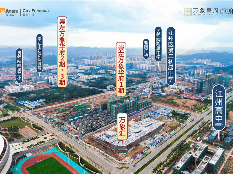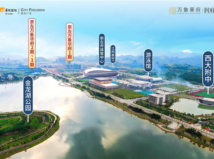 万象汇购物中心、金龙湖生态休闲公园、崇左市体育中心、江州区第二初级中学、江州区第五小学、广西民族师范学院附属第三小学(在建)等