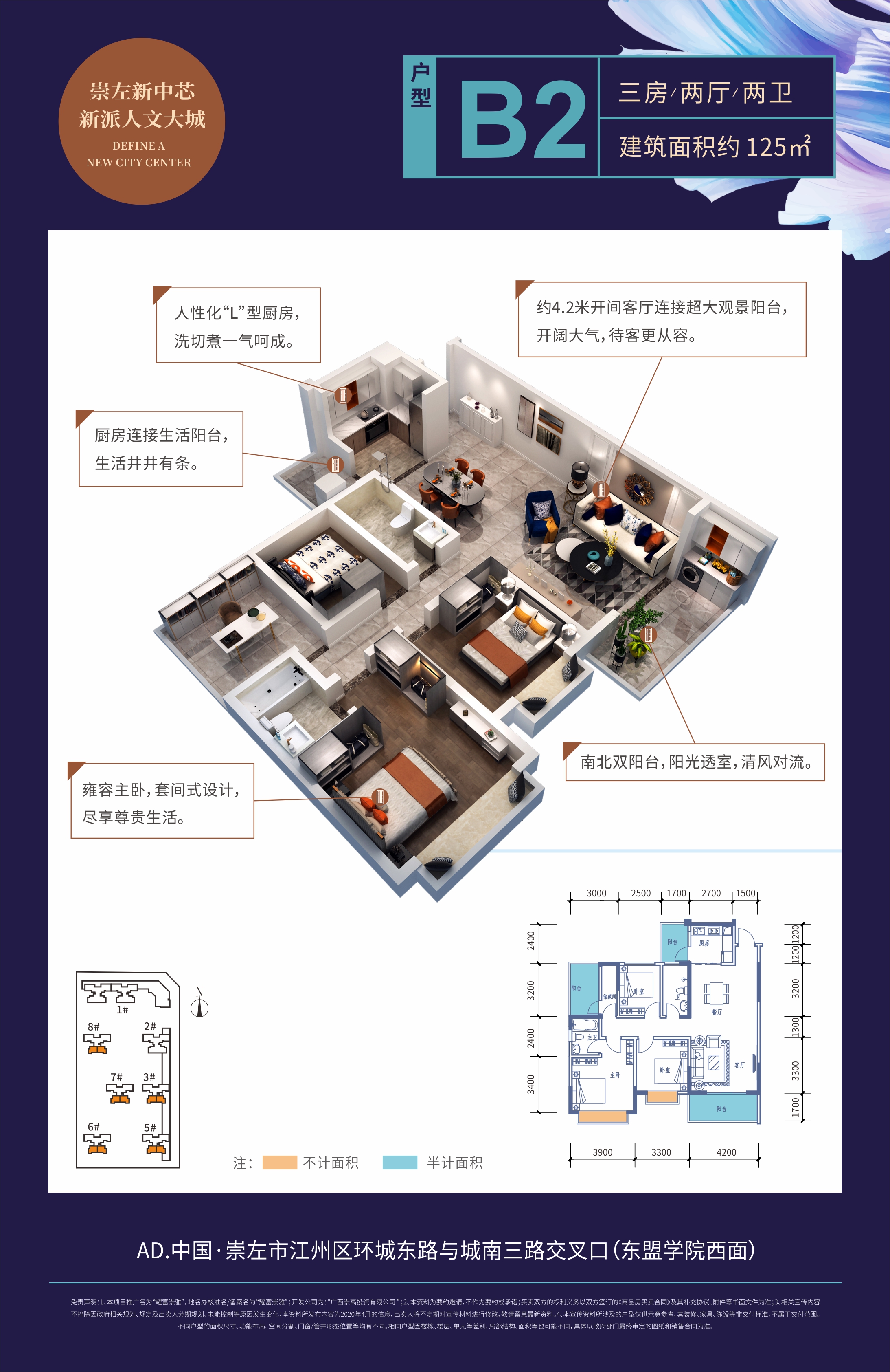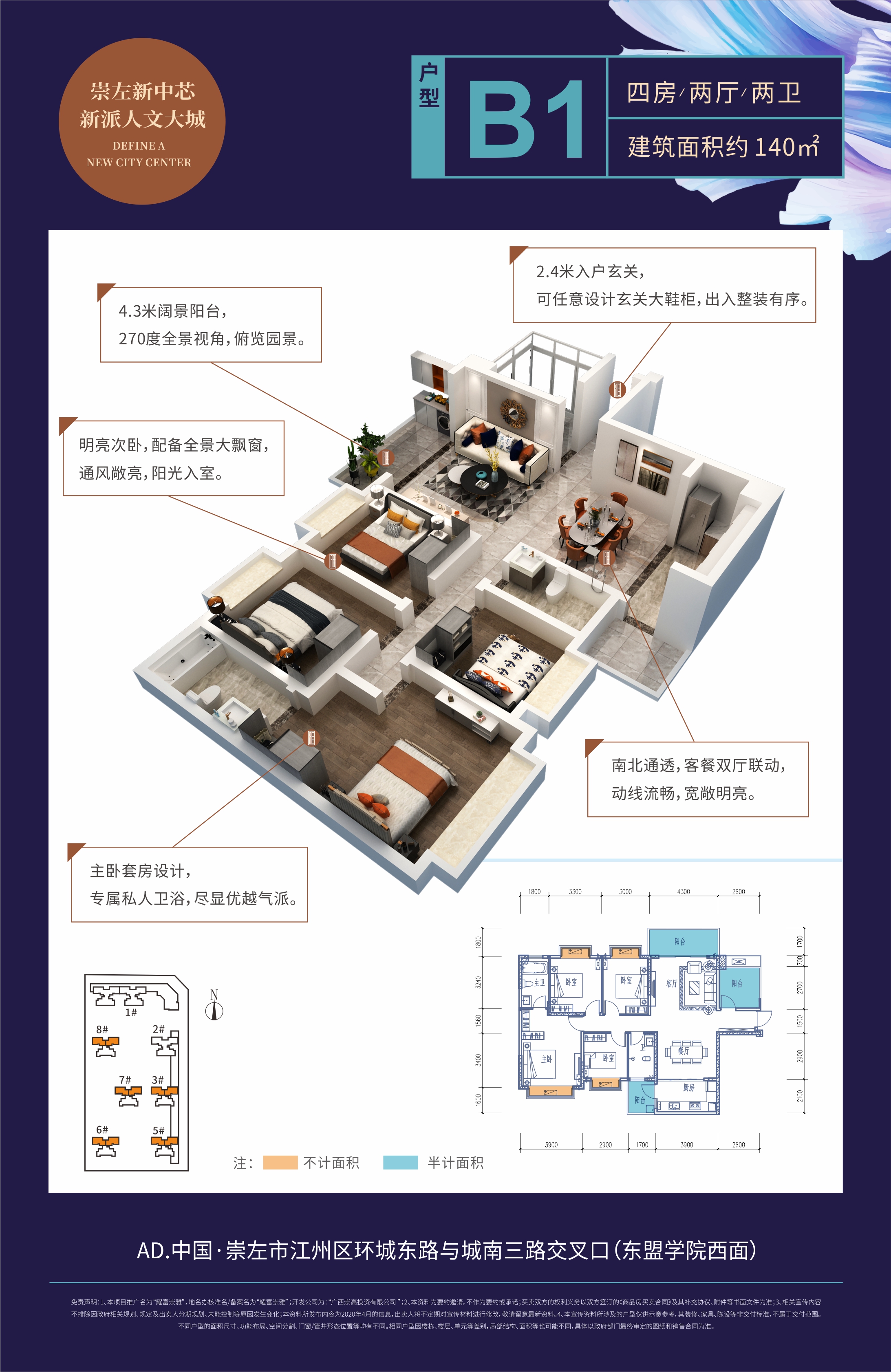 项目占地49亩,坐落于崇左城南新区,核心居住区,教育中心圈,周边10+所名校环绕,商业配套市政配套齐全,出则繁华入则宁静,设计上,采用现代化风格打造,外立面线条流畅,共由7栋楼组成,停车位超1:1的比例。小区内部采用人车分流的全新安全管理模式,绿化面积达到11443㎡,回家即是逛公园,采用独栋独单元纯点式布局,超百米楼间距,是不可多得的高圈层学区旁美宅。