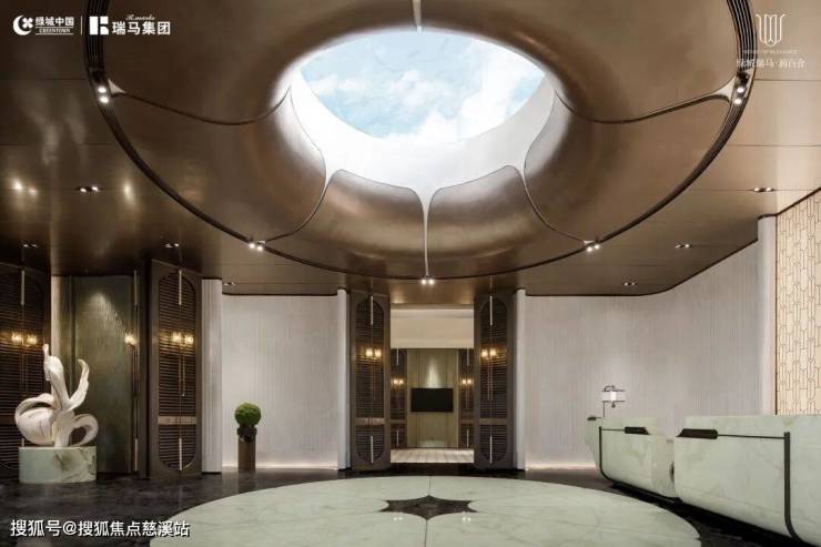 步入百合礼厅,青玉材质的地面与顶部百合花卉形态的天窗设计相得益彰,阳光透过天窗与水景,映射出“泉水、青玉、百合、锦鲤”融合的光影效果。