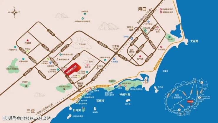 项目所处兴隆旅游度假区,为全城置业热土所在,紧邻城市主干道,距离海南东线环岛双高速路口(石梅湾互通、神州半岛互通)约6公里,神州高铁站约6.6公里,门前有3路、5路、6路和102路等公交,出行便捷无忧。
