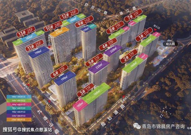 根据规划指标,唐岛湾君汇项目占地面积60040㎡,建设17栋建筑,总建筑面积223433.21㎡(地上总建筑面积156923.21㎡,地下总建筑面积66510㎡),容积率2.6,绿地率30%,建筑密度24%,停车位数1506个,共790户。来看看唐岛湾君汇的分布图,最低17层,最高25层,给人的第一感觉确实是挡光+压抑: