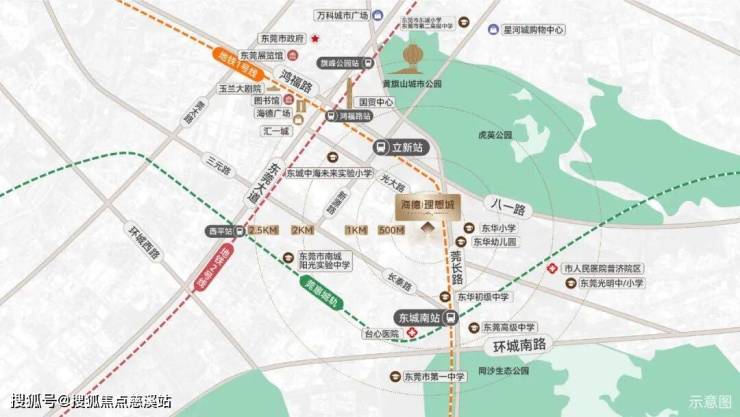 海德理想城约1公里范围内有地铁1号线和广惠城际,从项目步行约900米可到地铁1号线的立新站,步行约1.5公里可到广惠城际的东城南站。