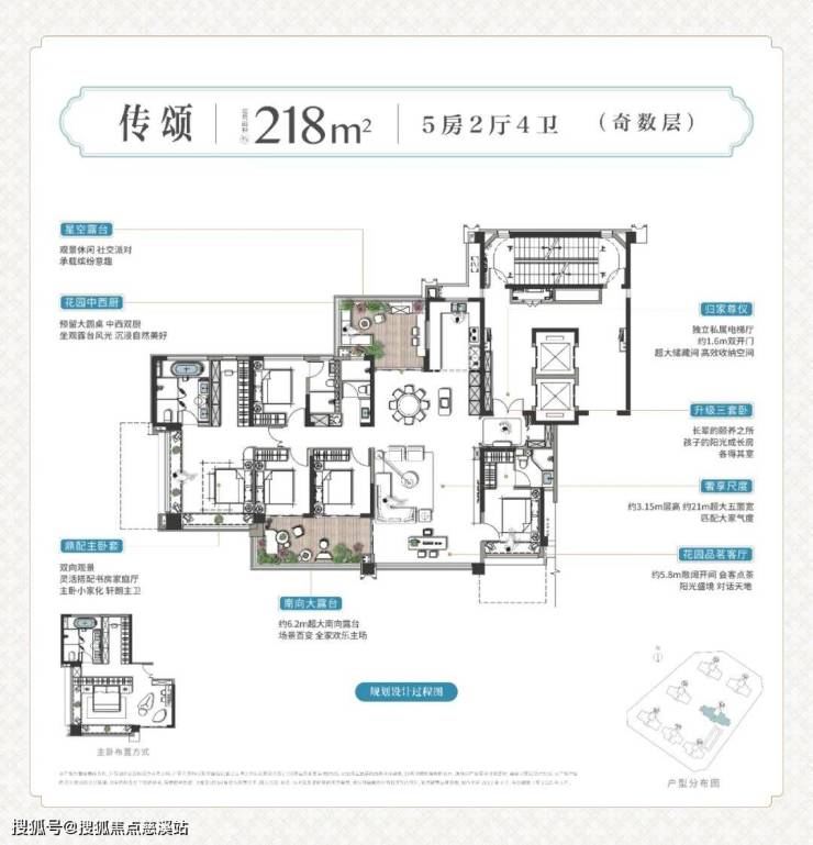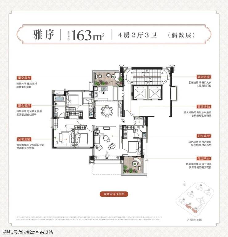 其次,类独梯独户、入户带独立储藏间、户户私享空中露台、四房三套卧等大平层户型才有高阶尺度配置,如今在该户型亦可实现。