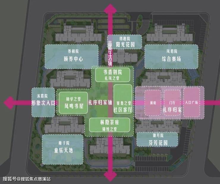 项目传承凤鸣书院的空间格局和文人雅趣,呈“一环、一心、两轴、六进空间及八大主题院落” 串联整个空间序列,打造多层庭院递进的景观空间结构,形成一处兼具人文内涵与时尚居住的现代社区,营造书香浸润的独特景观体验。
