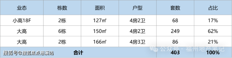 项目定位150㎡户型为主,南侧排布两栋127㎡户型,为小高层,其余均为高层,其中: