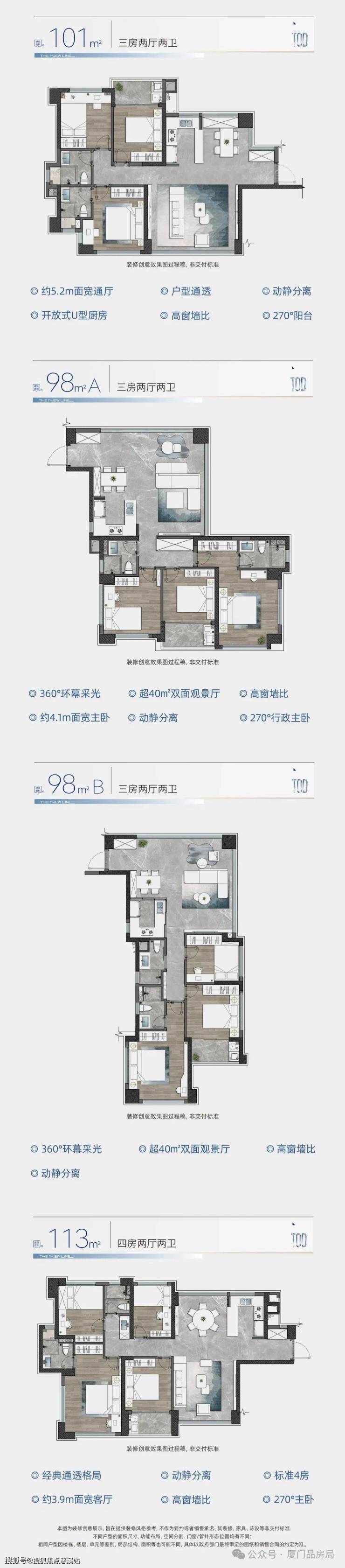 从产品设计来说,二期在一期上基础进行了全面升级,优化户型提升套内得房率,例如101平就做出了边套3+1房格局,另外还有一栋楼王大户型作为海沧湾首个第四代产品出现。楼栋分布也比一期更加合理,围合式布局超大中庭,平均楼间距超百米,视野采光都更好,容积率仅3.3。