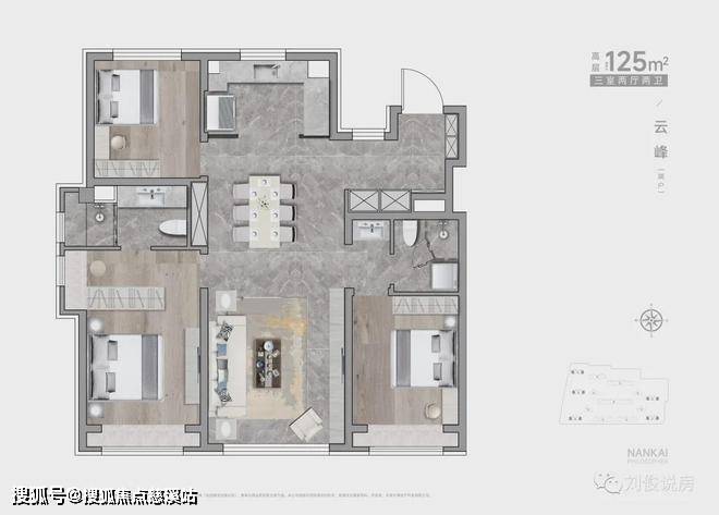 (1)5栋高层,两梯4户,中户105平,边户125平,都是三室两厅两卫。