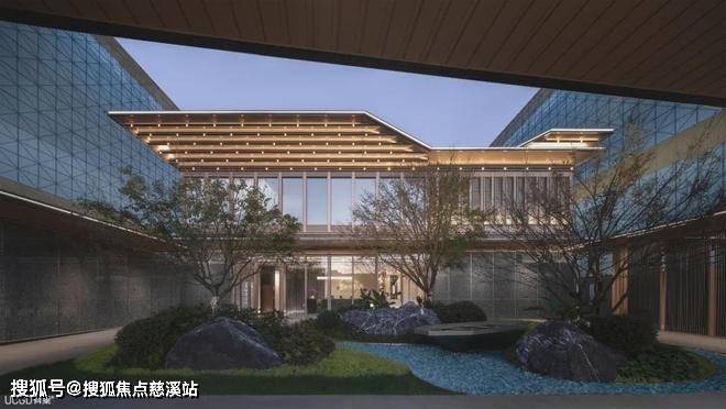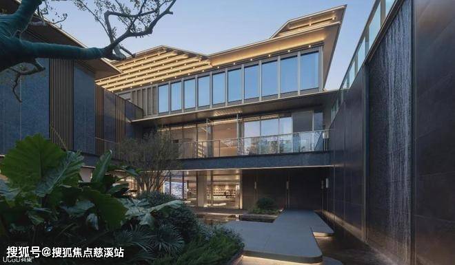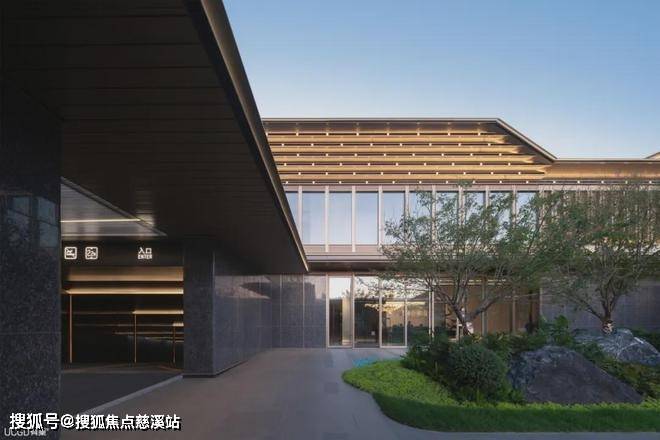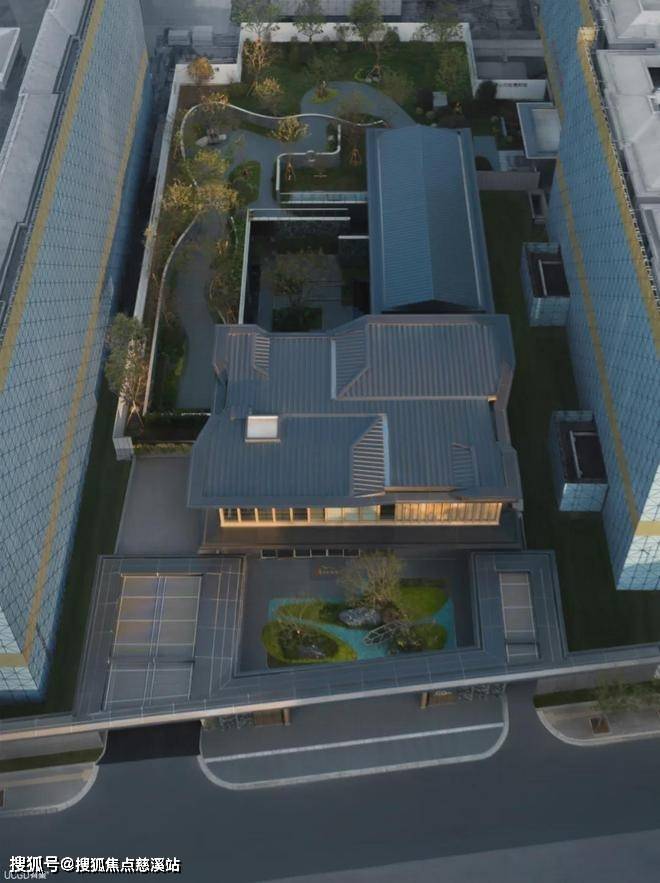 入口庭院以装置艺术元素为点睛之笔,将江南建筑的屋檐与层叠山脉融为一体。设计独具匠心,创造了层叠错落的檐口。与此同时,景墙沿着双拜岗牌楼路一直延伸,与庭院景观装置相结合,巧妙地围合出私密而独享的空间,将街道的喧嚣隔绝在外。