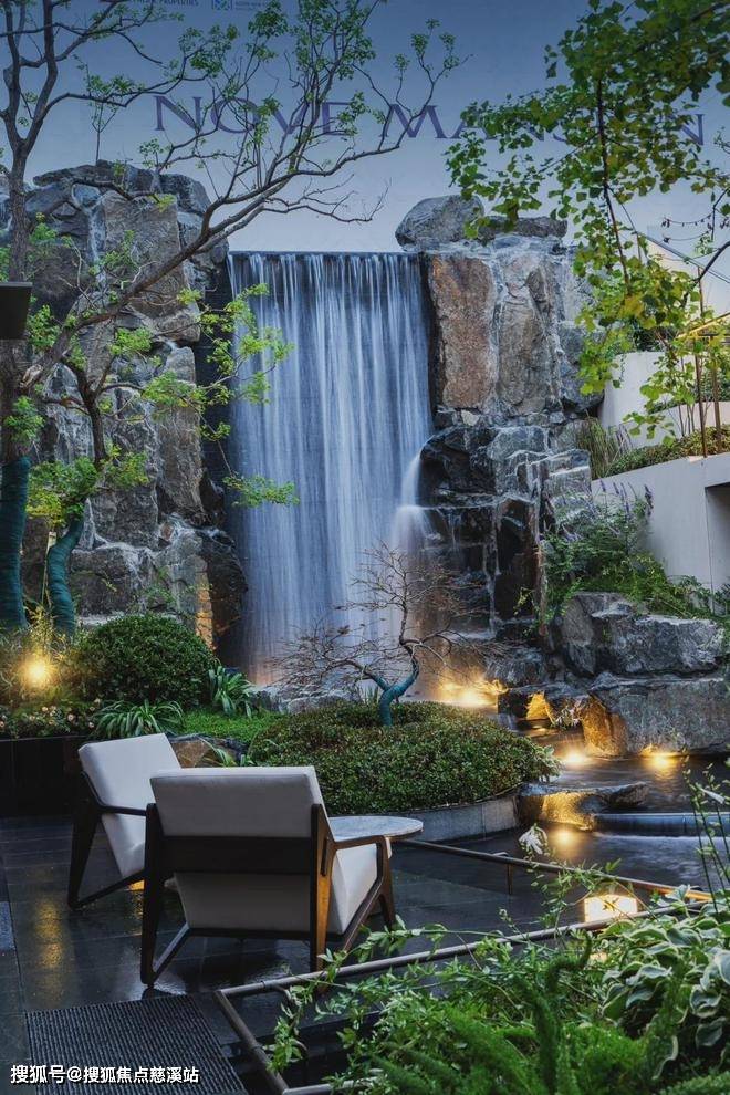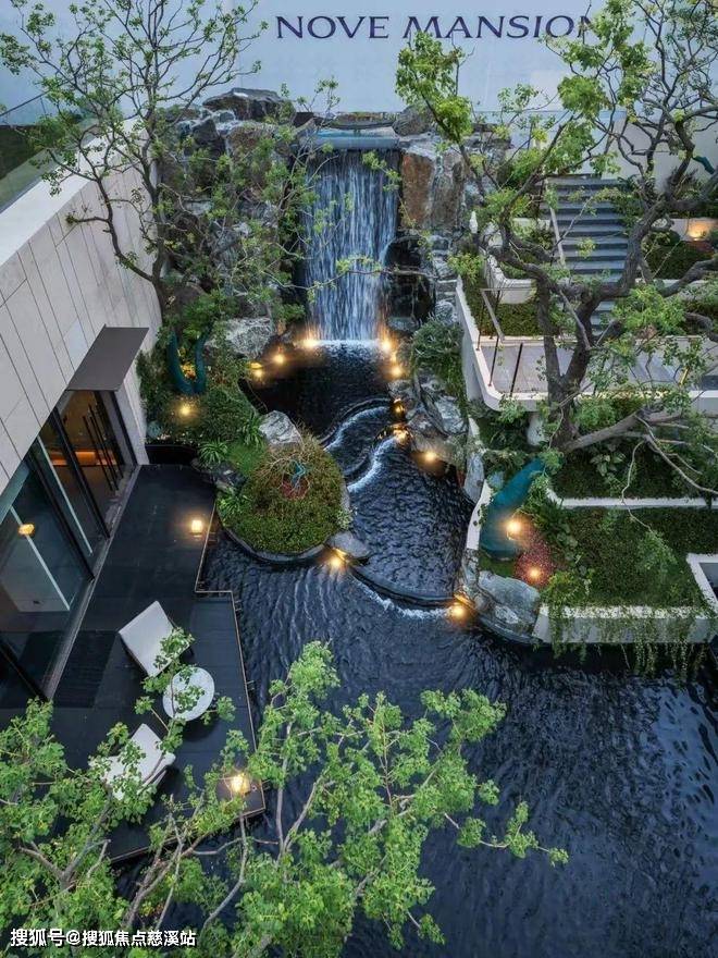 横向约160m景观中轴之上,双下沉式庭院、三重叠水景观