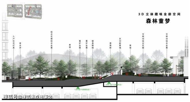 儿童森林童梦:深研现代家庭儿童成长轨迹,依托地势高差,打造森林童梦主题游乐区,云中隧道、攀爬墙、滑滑梯、看护区等多功能于一体的儿童游玩场地,分龄段设计,满足0-12岁儿童的成长玩乐需求。