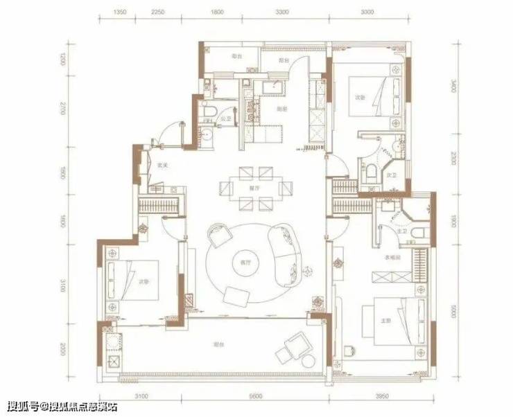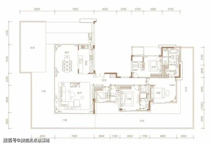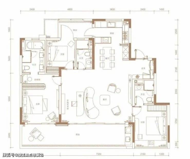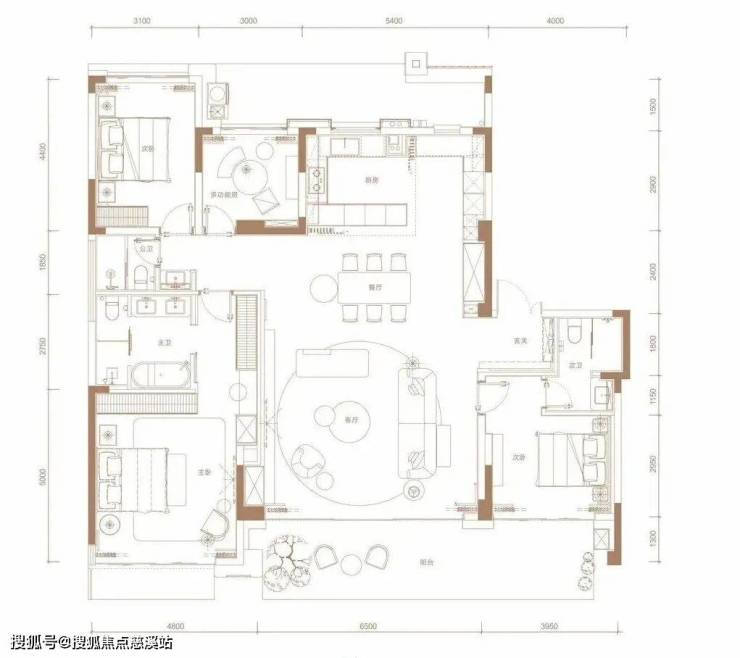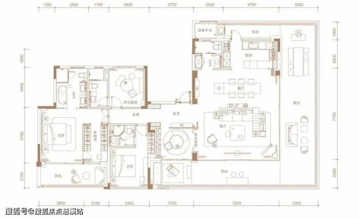 242㎡三套房设计,动静分区,玄关进来,就是多功能房,右侧是三间套房,左侧为LDKG一体化公区,很大气,最大看点是带270°全景环幕露台。