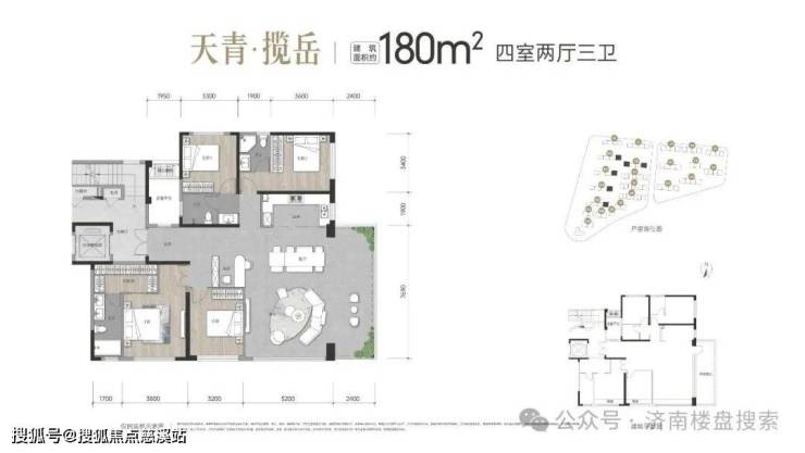 约180㎡四室两厅三卫:私享入户电梯前厅;约270°转角环厅+约7.7米开敞阳台设计,约16.3米超大南向四面宽,巨幅落地窗;入户设备平台,约5.5米面宽主卧,双开门+步入式衣帽间;约5.5米面宽豪华北套卧。